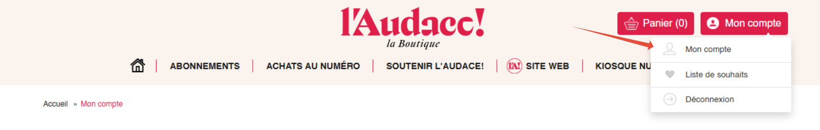 Si vous êtes connecté sur la boutique L'Audace, il est indiqué "Mon compte" en haut à droite de la page d'accueil.