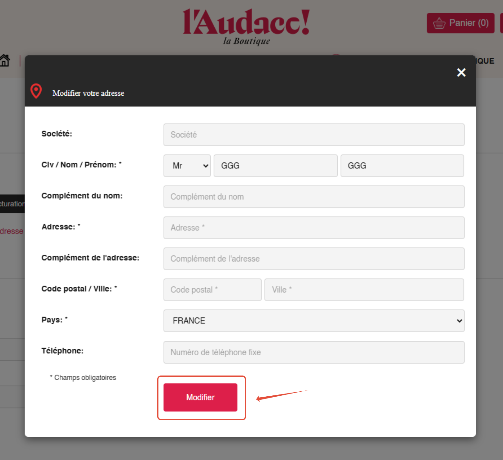 Vous pouvez modifier votre adresse de livraison sur la boutique L'Audace en vous connectant à votre compte client.