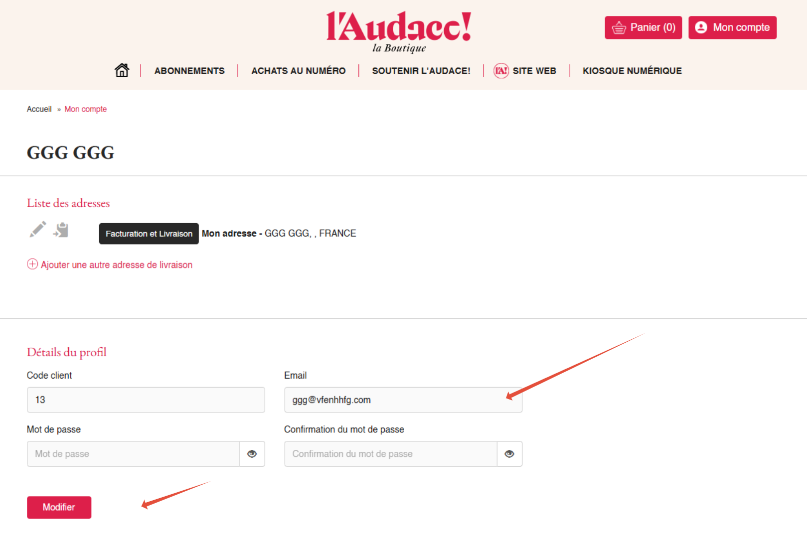 > La modification de votre adresse e-mail dans votre compte ne modifie pas l'adresse e-mail de réception des newsletters. Consulter la méthode pour modifier l'adresse e-mail de réception de la newsletter L'Audace.
