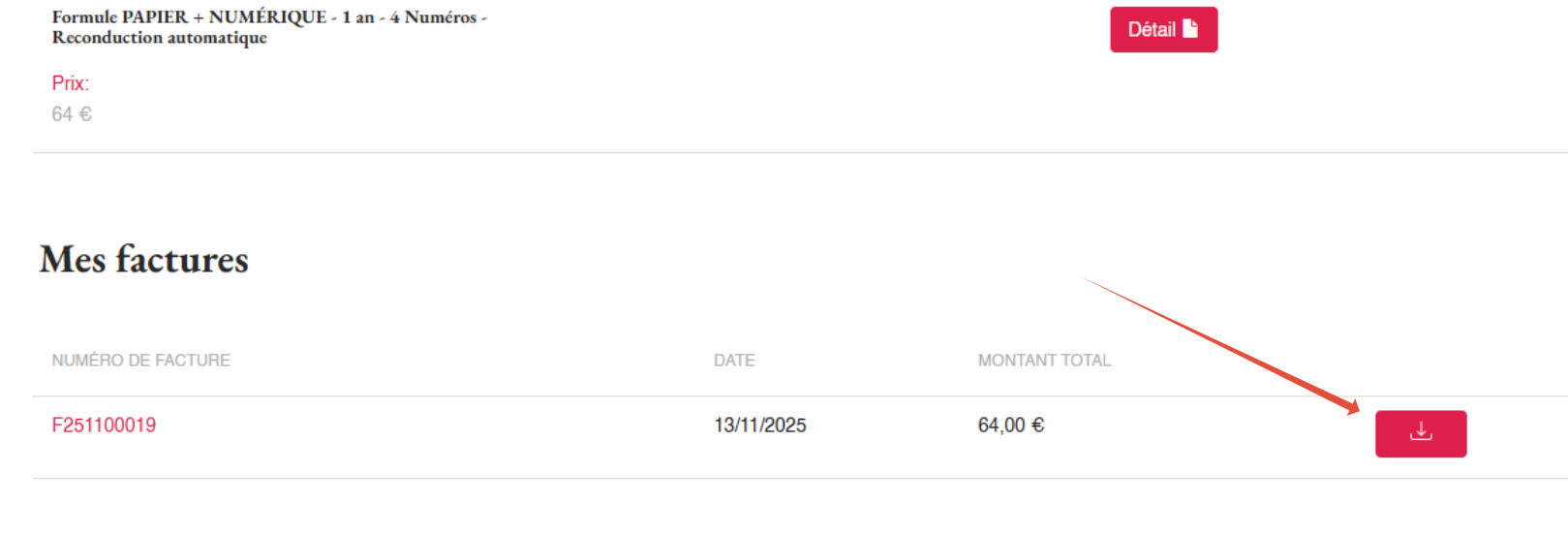 L'ensemble de vos factures d'abonnement ou d'achat de es à l'unité sont disponibles sur la boutique L'Audace depuis votre espace client.